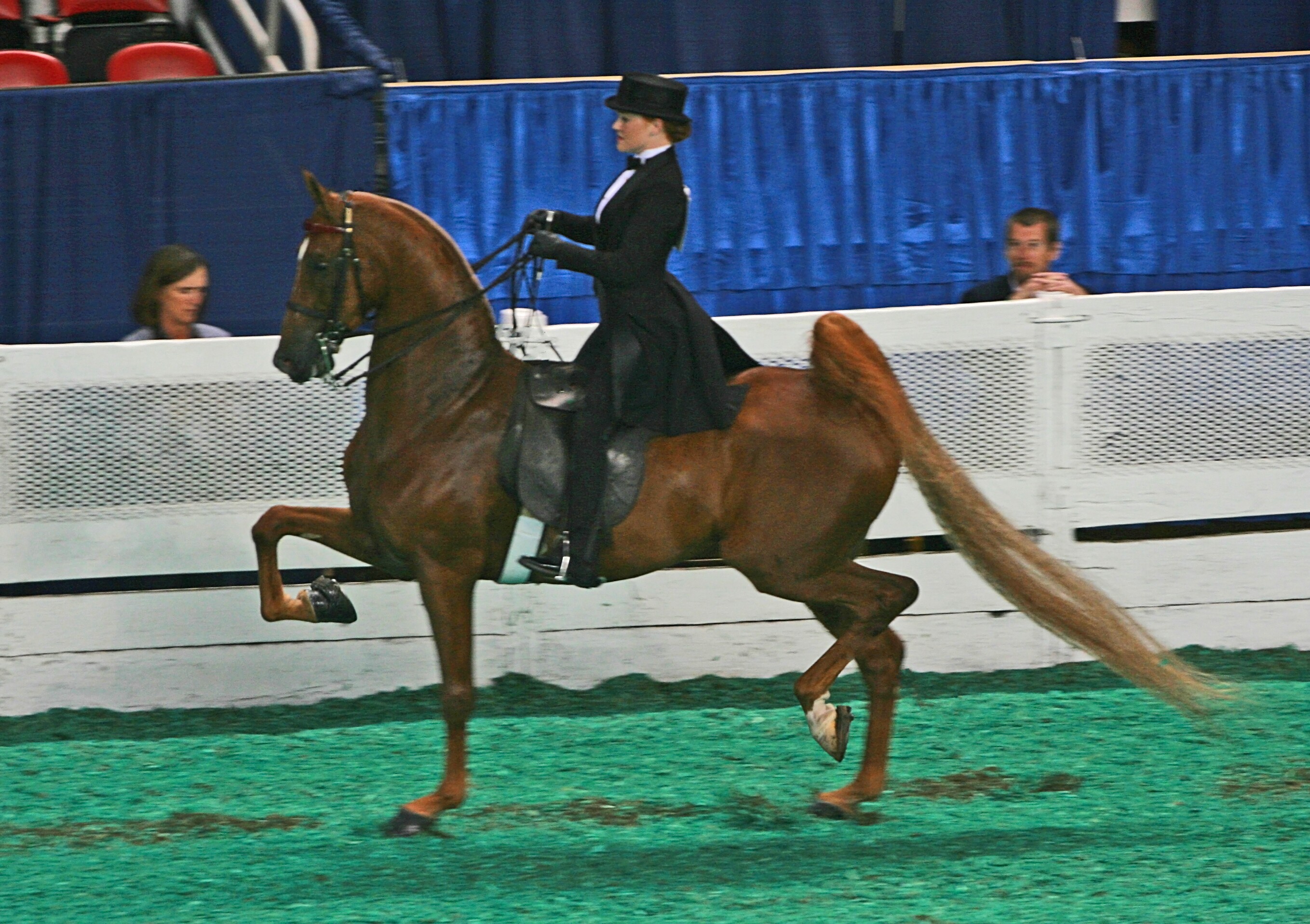 Saddle Seat is a style of horseback riding that is designed to show off the high trotting action of certain horse breeds. The style developed into its modern form in the United States, and is also seen in Canada and South Africa. To a much lesser extent, it is ridden with American action horse breeds in Europe and Australia.The goal of the Saddle Seat riding style is to show off the horse's extravagant gaits, particularly the trot. Read more...