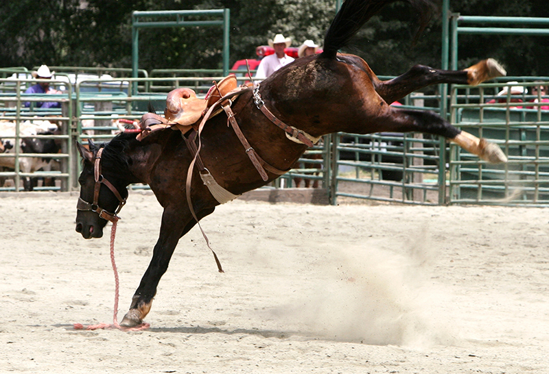 Bronco riding is an equestrian sport that is part of rodeo competitions. In bronco riding, a rider attempts to stay on a bucking horse for eight seconds. The horse is typically a young, unbroken horse that is specifically bred for its bucking ability. The horses are called broncs or broncos.